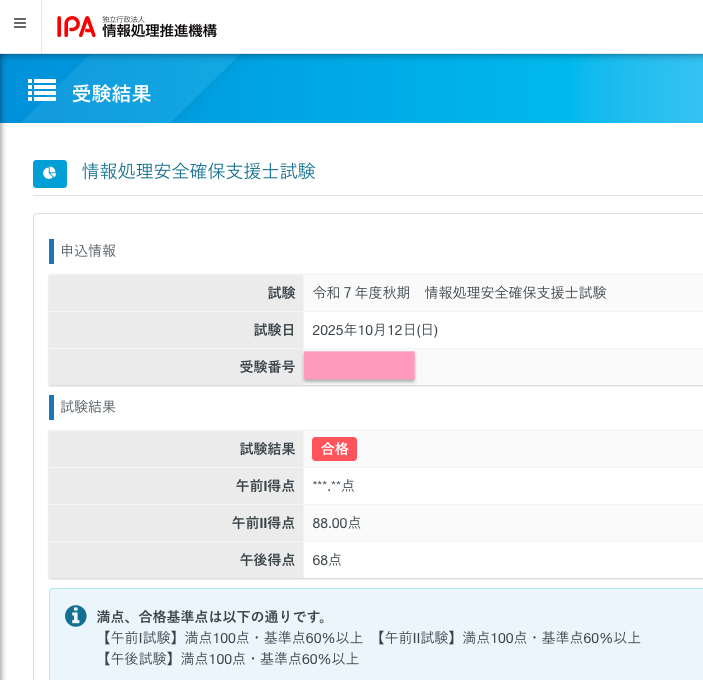 午後問題は68点とギリギリではありましたが、合格でした。令和7年の秋季試験のSCの合格率は22.3%で、それまでの合格率よりも若干高くなっています(令和7年春は19%)。私はまた運がよかったのかも? 何にせよ、受かってほっとしました。諦めずに最後まで頑張ってよかったです。