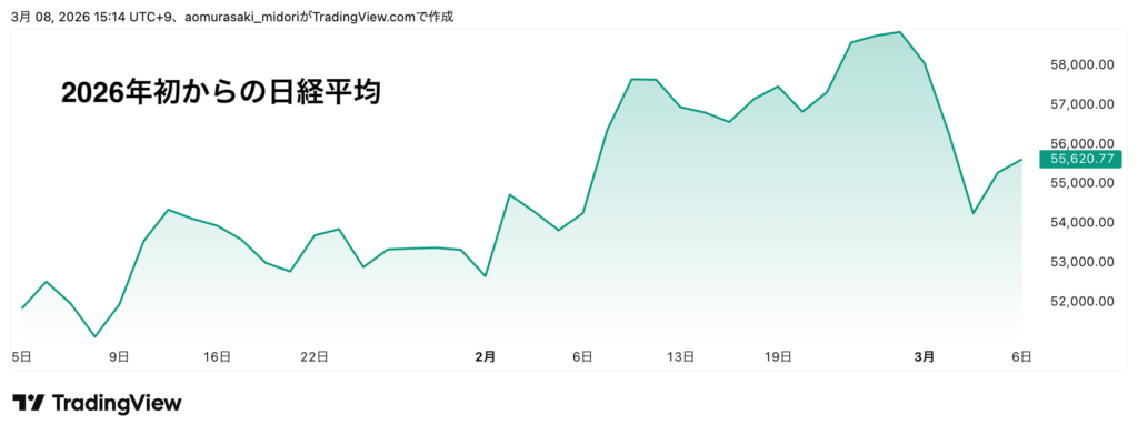 で、今(20260308)、日経平均は年初よりは値上がりしているという状況なんですが、